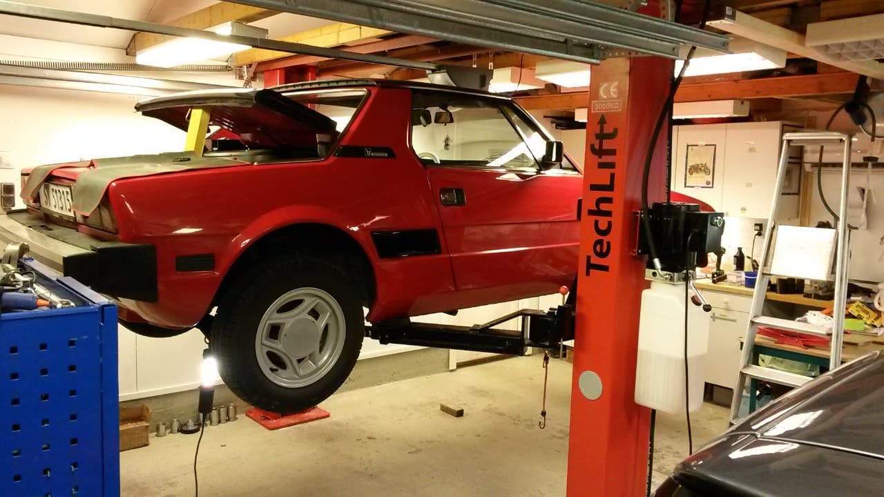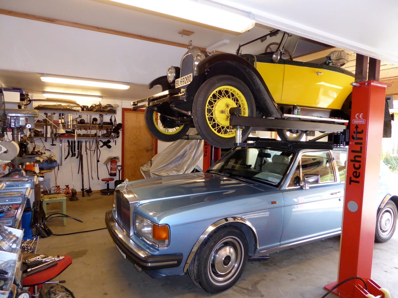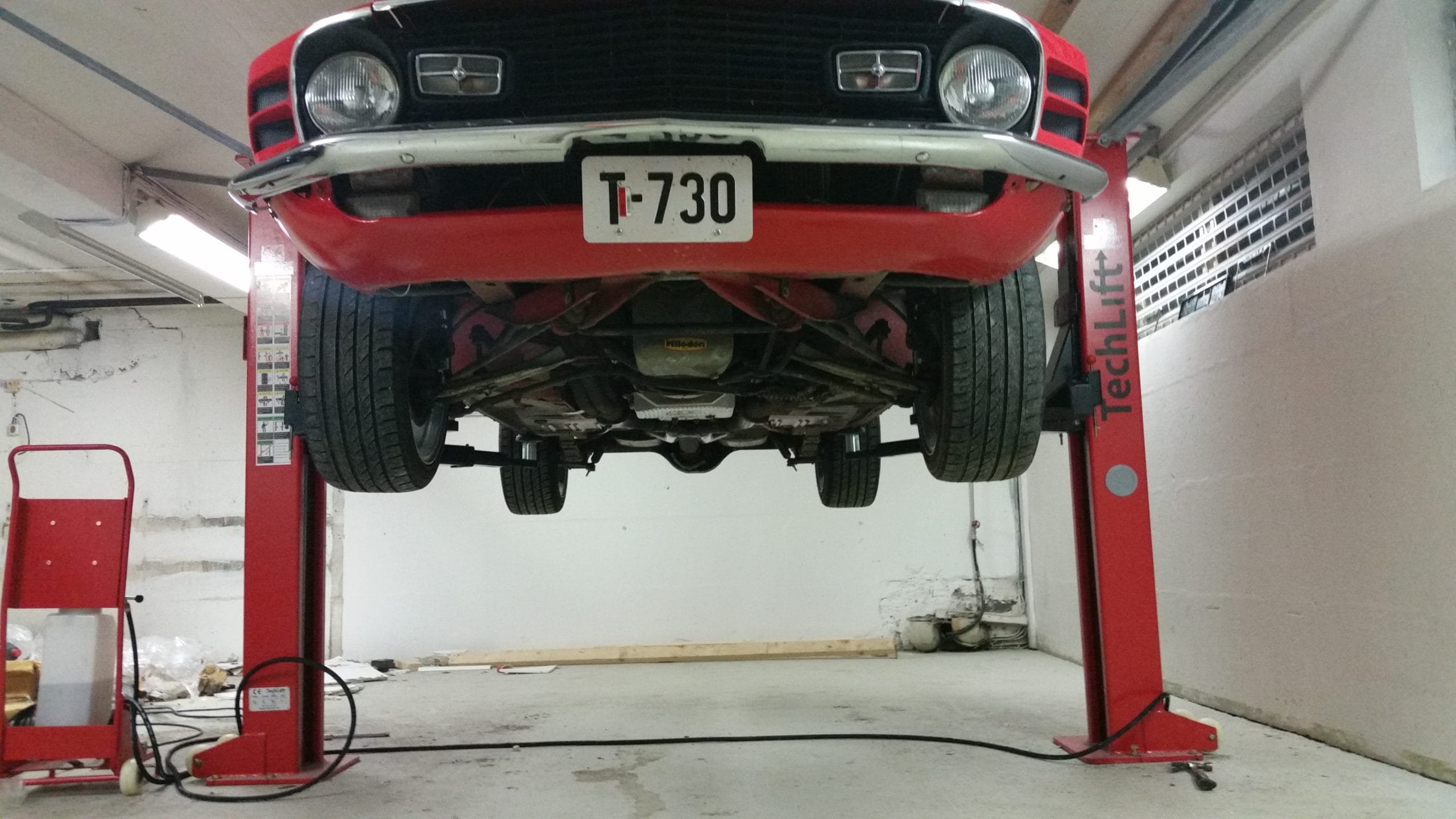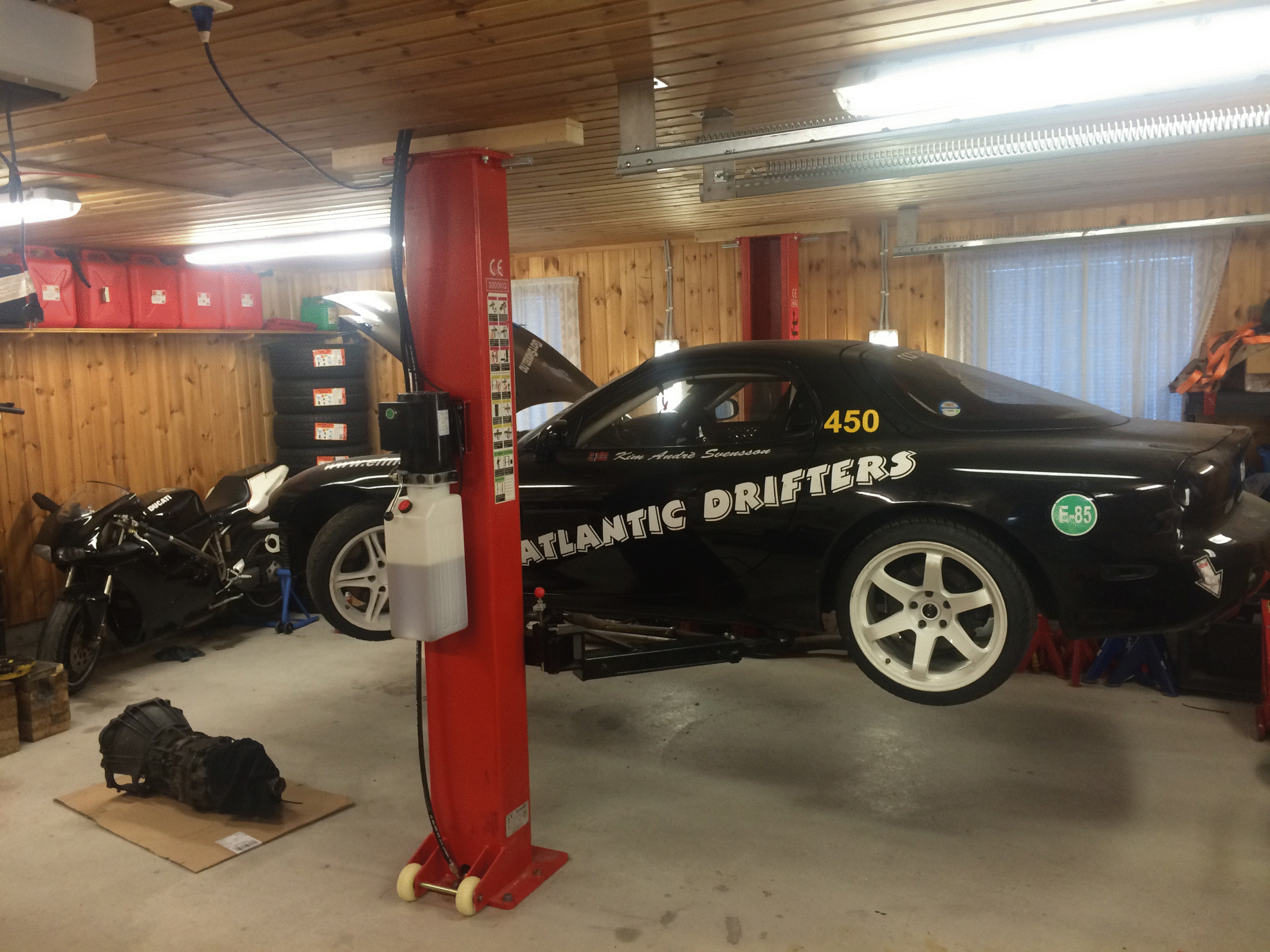 Godt fornøyd med løftebukken. Hadde tynt gulv så måtte støpe på nytt 1x1meter og ca 40-50cm dypt. Tykk stålplate i bunn med 16mm jengestag igjennom med muttere på baksiden. Ble støpt oppå dette. Bygde om taket for å oppnå høyden. Kan løfte helt opp med panser oppe nå! Sliter med en 16A b classe sikring…